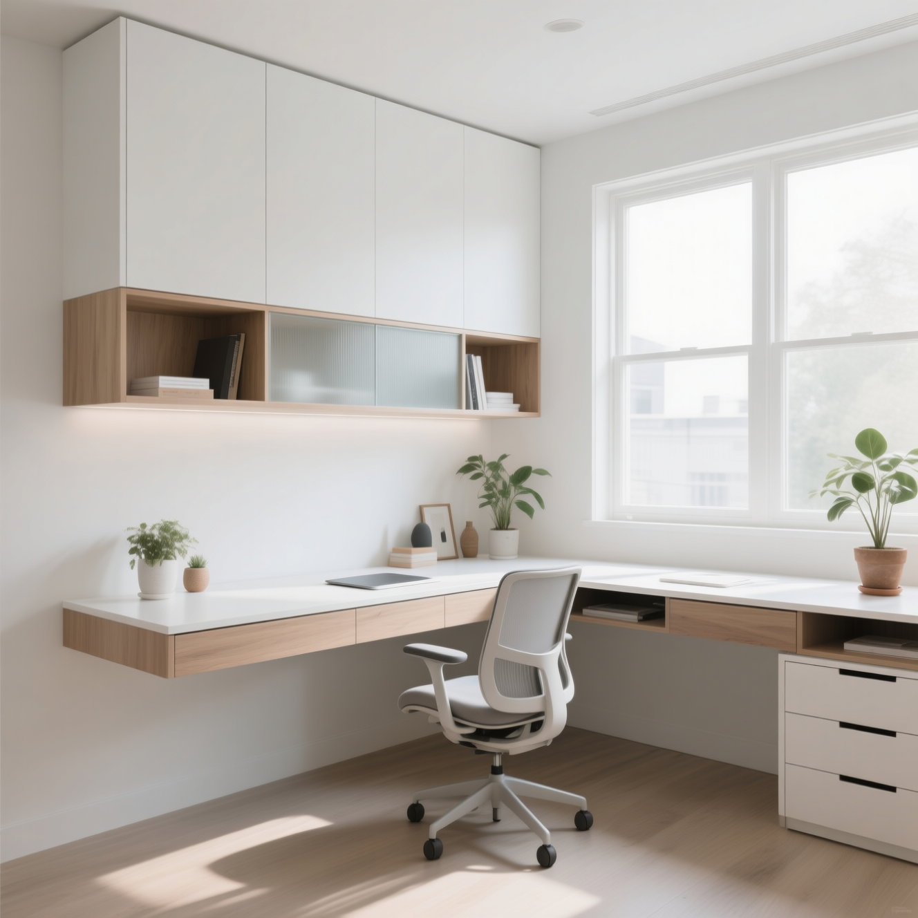 A complete transformation of a small bedroom corner into a clean, minimalist home office that maximizes productivity.